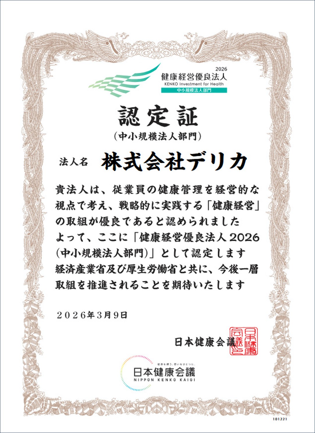 経済産業省及び日本健康会議から「健康経営優良法人2026(中小規模法人部門)」 に認定されました。当社は8年連続の認定となります。